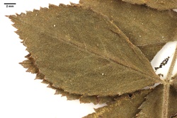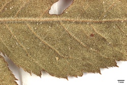 Strauch sehr hoch, lockerwüchsig; Blätter oberseits mäßig behaart, unterseits etwas dichter behaart aber nicht dicht behaart; Griffel mäßig bis stärker behaart; Blattzähnung mehrfach drüsig; Sepalen seitlich