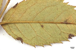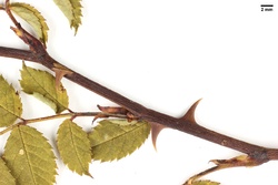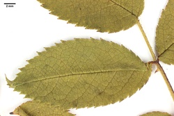 det. V. Herklotz als Rosa canina L. var. dumalis Baker / conf. J. Wesenberg 2014 als Rosa canina L. var. glandulosa A. Rau / Anm. J. Wesenberg: Der Varietät glandulosa zugeordnete Ausbildungen der Rosa canina tragen Drüsen am Rand der Blätter und Nebenblätter, der Rhachis und dem Hauptnerv der Blattunterseite. Fruchtstiele und Früchte sind drüsenlos.